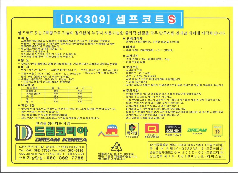 셀프코트S는 2액형으로 기술이필요없이 누구나 사용가능한 물리적성질을 모두 만족시킨 신개념 차세대 바닥제